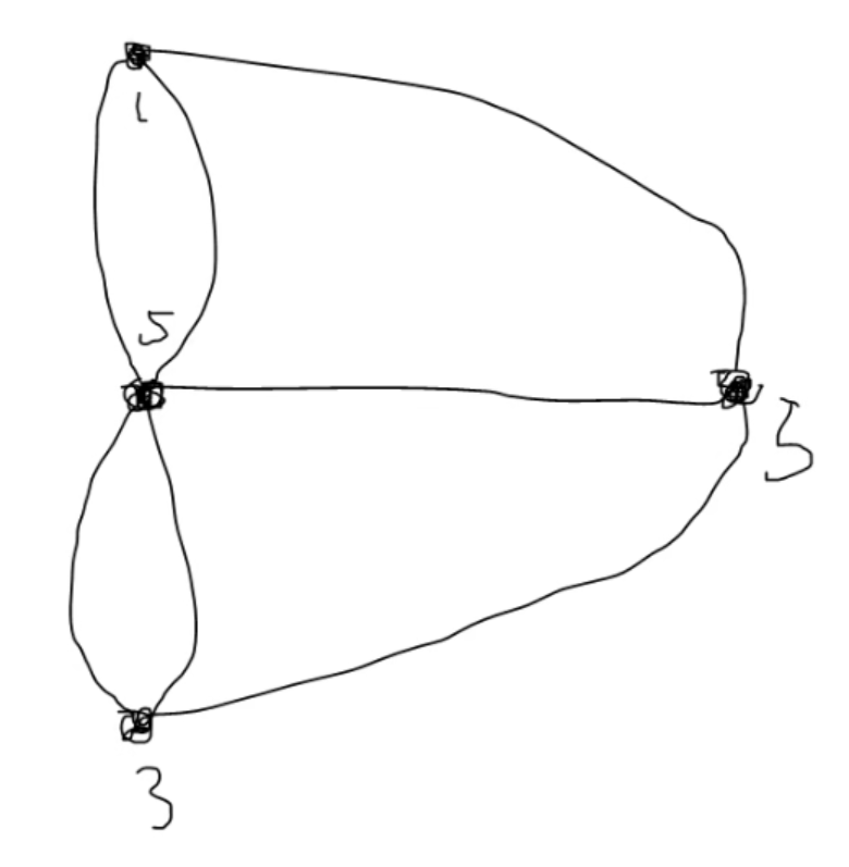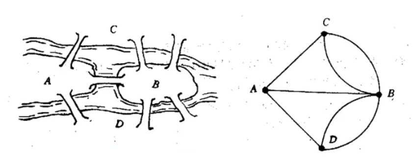 哥尼斯堡有七座桥将普莱格尔河中的两个岛及岛与河岸联结起来,问题是要从这四块陆地中的任何一块开始通过每一座桥正好一次,再回到起点。