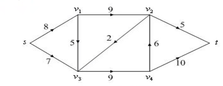 市t,中间有4个中转站$v_1,v_2,v_3和v_4$,城市与中转站的连接以及管道的容量如下图所示,求从城市s到城市t的最大流。
